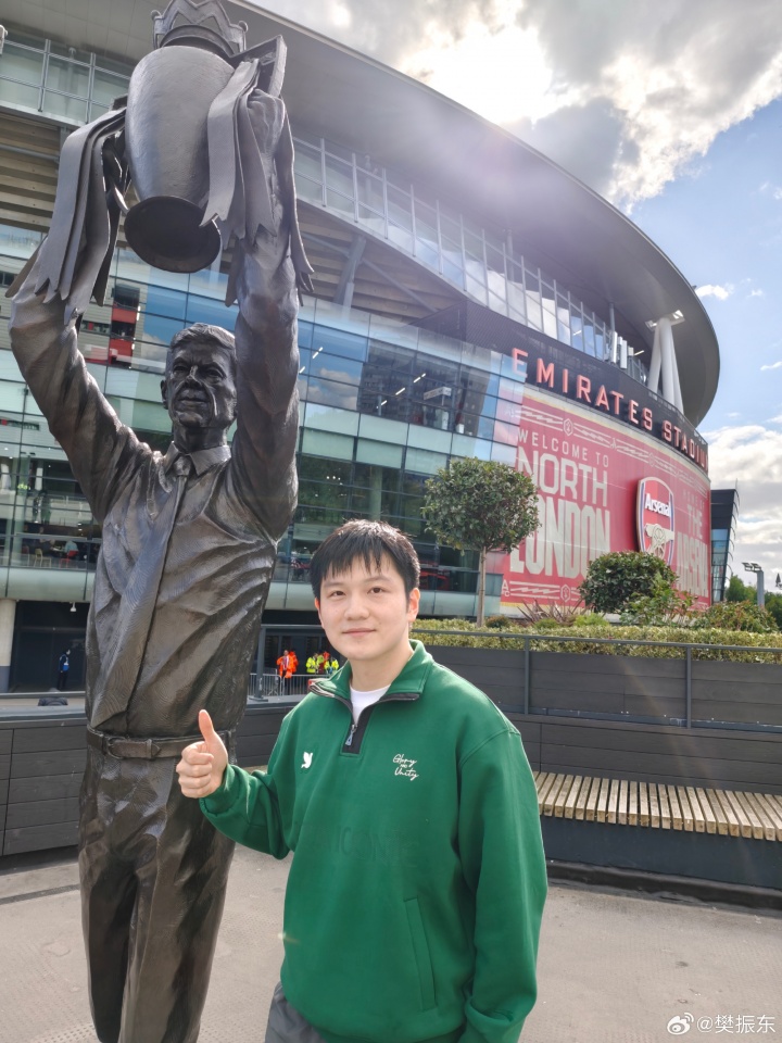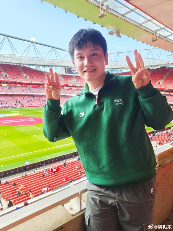 直播吧09月22日讯 昨晚英超第5轮焦点战,阿森纳主场1-1战平曼城。目前在德国俱乐部萨尔布吕肯乒乓球队效力的樊振东现场观看了这场比赛,并在社媒中分享了观赛感受。